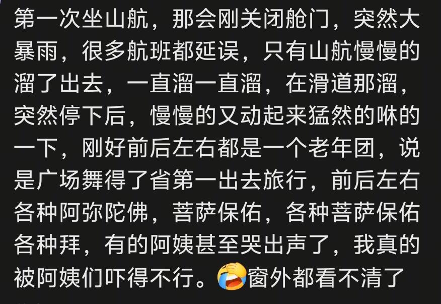 有一次我坐山航,刚坐好,还没起飞,就下起了雨,我问空姐还能飞吗,空姐微笑着说,放心先生,我们机长以前在部队开轰炸机的。